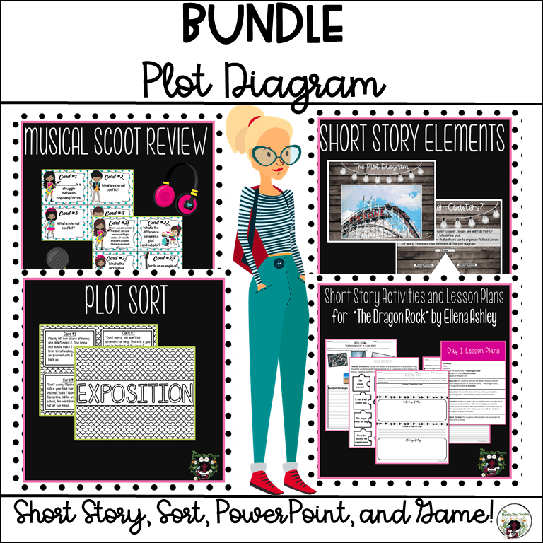 The plot diagram can be hard for students to understand. As a result, I try to make it interesting and fun, but also I give them visuals that will help them remember each stage of the plot, and I do this by showing a video of a local roller coaster that my students can relate to the pyramid. After introducing the exposition, rising action, climax, falling action, and resolution, my class watches the video for fun the first time. Next, I show it, again, and we switch into discussion mode. I ask my students where each part of the plot diagram is located on the roller-coaster. Then we make up a scenario/examples for each step of the way. My students really love this visual, and it helps them remember the elements. You can find this PowerPoint by clicking here.